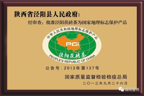 2016年1月"咸阳茯茶"荣获国家工商总局颁发的地理标志证明商标